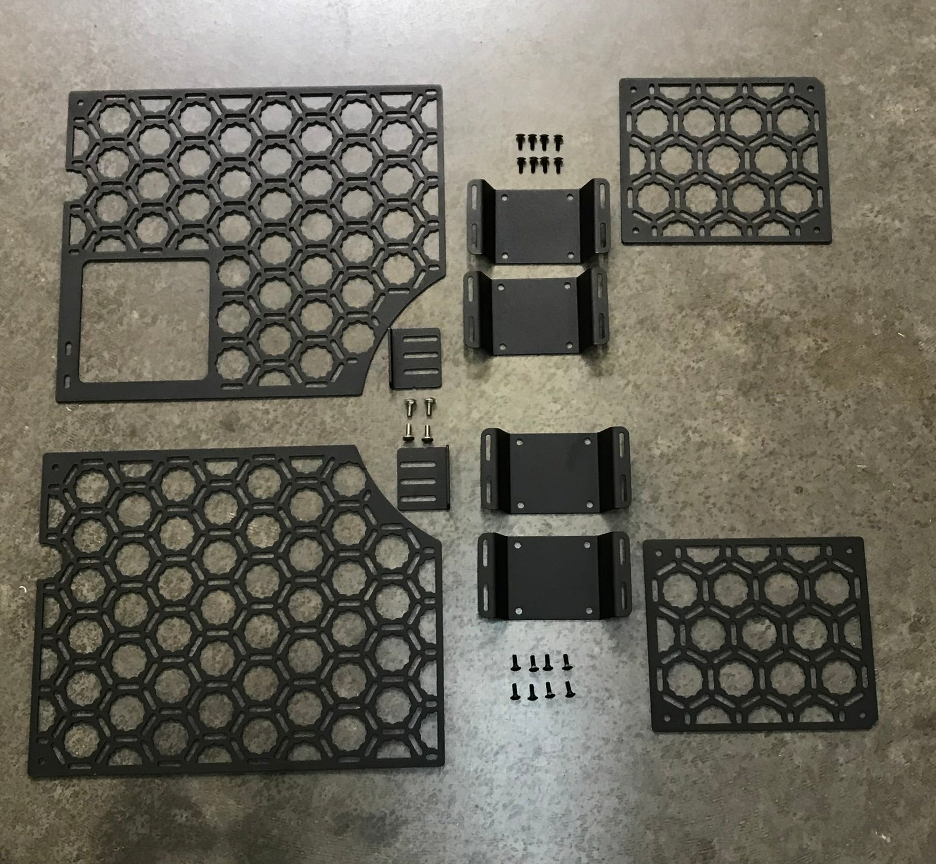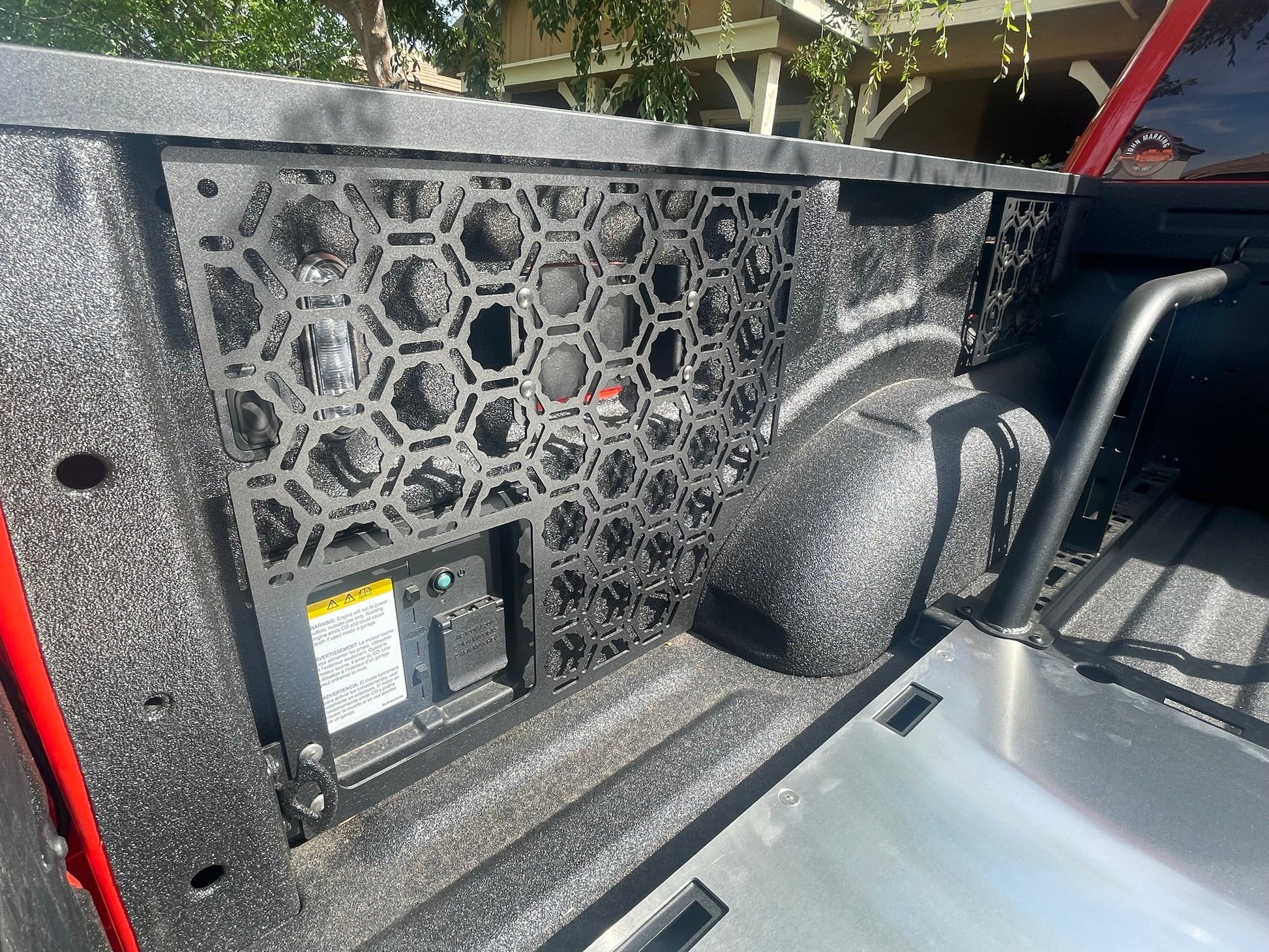 The new Adapt-a-panel bed organizer panel kit gives you the ultimate flexibility in getting your gear organized. The panel is made out of .135" thick 1018 steel for the ultimate strength. The bed wall mounts are also made form the same .135" thick steel and precision bent to fit your truck perfect. Quick attach to existing hardware locations with the included hardware kit. Use the Grid Inserts to mount any accessory you want to carry, even the heavy stuff like power tanks and high lift jacks. Grid Inserts can be added any time after install to make it easy to change your load out depending on your situation. Full panel coverage even over the cleat area gives you the most square feet of mounting surface available.