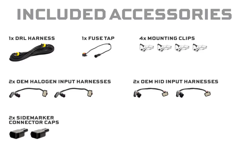 Accessories: 2x Halogen Input Harnesses, 2x OEM HID Input Harnesses, 1x DRL Harness, 2x High Beam Keys, 4x Mounting Clips, 2x Side Marker Connector Caps, Fuse Tap Hardware