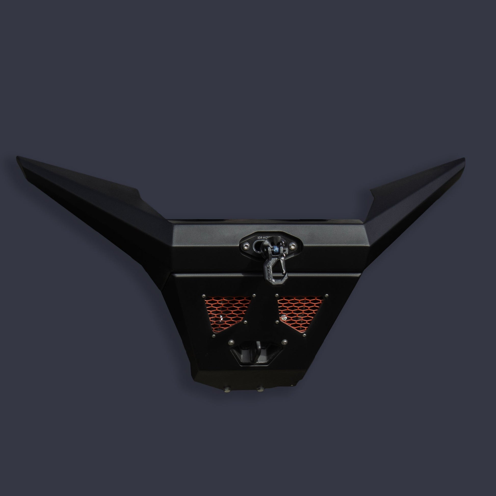 This new bumper design features a stout steel bulkhead that allows the mounting of your factory or aftermarket winch and comes equipped with an aluminum fairlead. The two-piece bumper shell is made entirely of aluminum to keep the weight down and the protection up! The top bumper bolts directly to the bulkhead and has mounting spots for most popular aftermarket lights like the 9-inch Triple R lights shown. The lower half of the bumper features a Pre-Runner style skid plate with grills that can be color matched to your color scheme and a cutout on the bottom exposing the beefy pull point/ tie down spot on the bulkhead.