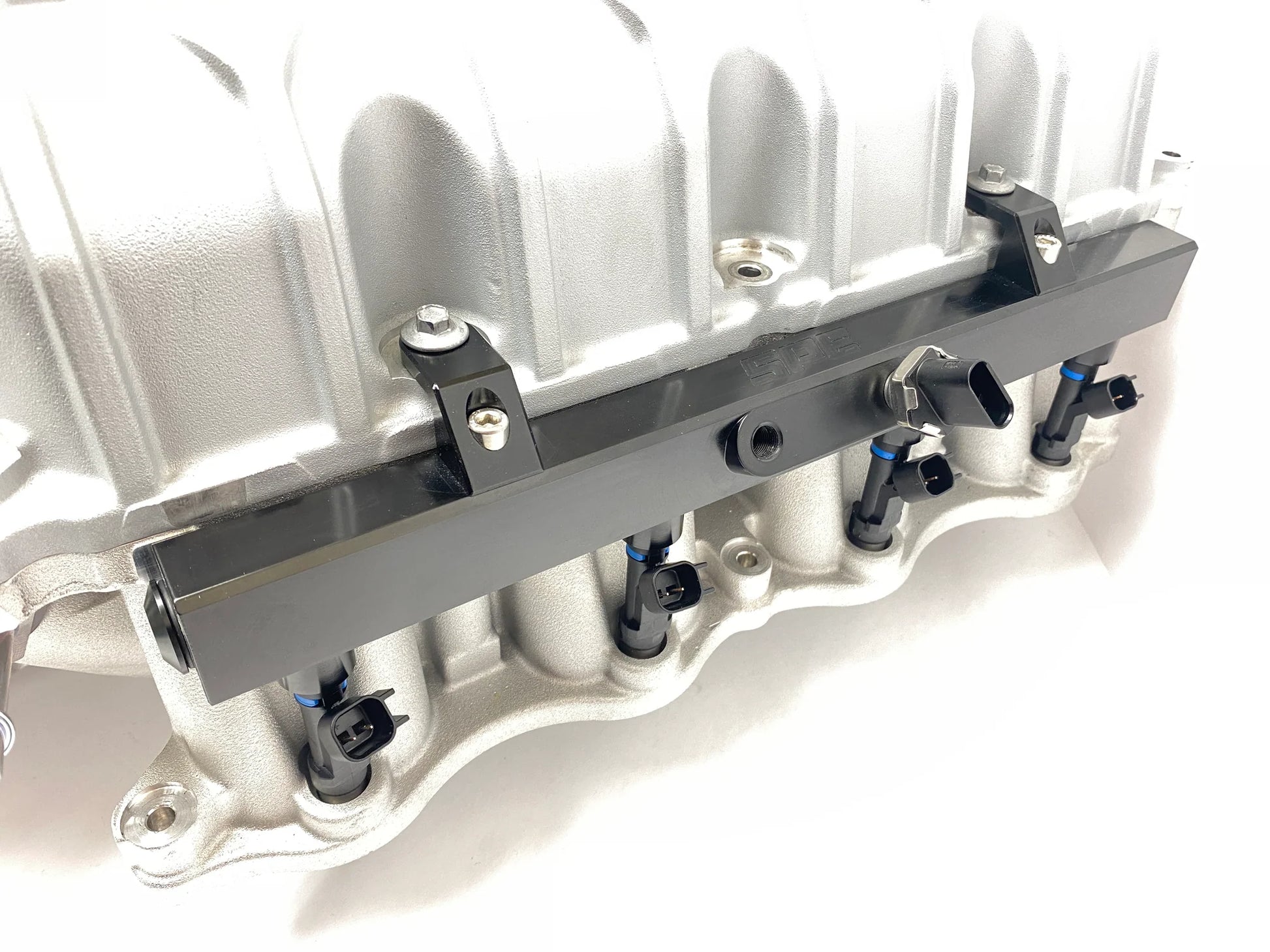 This is a complete fuel rail kit for your 2020-2022 Shelby GT500 which includes the fuel rails as well as all necessary hoses and fittings to install on your car using the factory fuel line up to the firewall. The fuel rails are -8 AN size made from billet aluminum and are anodized black. SPE has changed the angle of the factory fuel pressure sensor to allow for more clearance to keep it clear of the wiring harness. We also added two 1/8th inch NPT ports on each rail for fuel pressure or auxiliary fuel feed for nitrous systems.
