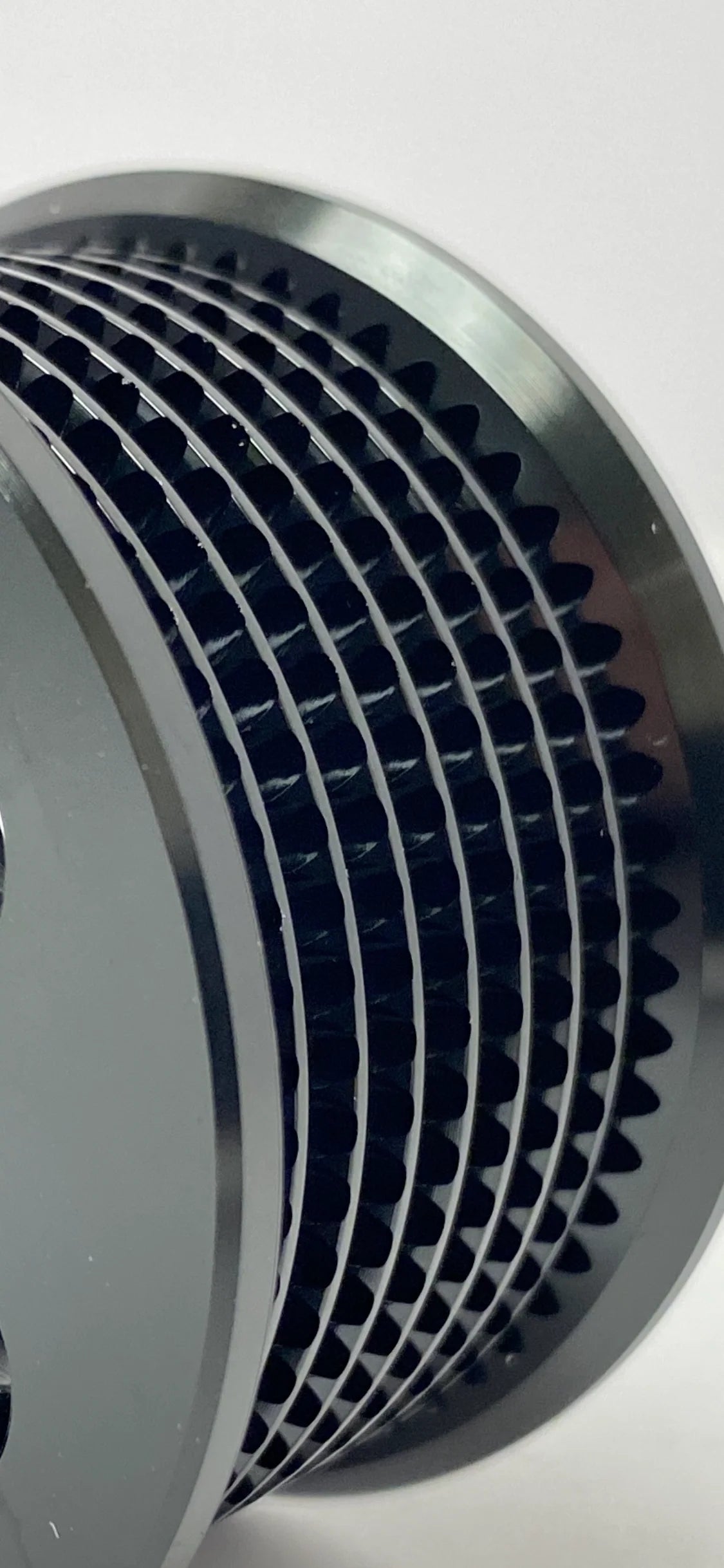 The patent pending CNC Convex Knurling process (CKP) on the SPE pulleys offers a perfect balance between belt grip and wear. The machining process allows the rib surface to offer varying grip under different belt loads. Under minimal boost (light Throttle) the belt tension is lower at the pulley face. The process offers a low load area for the belt to have normal factory-like contact on the rib face allowing the belt to wear less over time. When load is applied it is wedged down into the Convex knurling the grip becomes more aggressive to the belt the higher the load (Boost demand) becomes. This keeps the belt on a perfect grip/wear threshold. Unlike Laser surface etching found on our competitors' pulleys, our process doesn't degrade or wear off. Since our pulleys don't wear they are more consistent, giving the customer better track times and dyno numbers. Although SPE's CNC Convex Knurling Process is costly to produce, we are more concerned with providing our customers the best quality product at the best price possible.