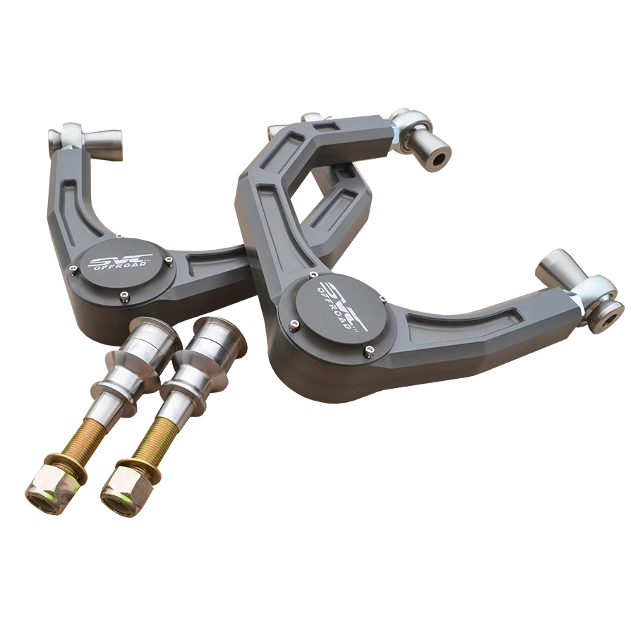 SVC Offroad UCA's increase the strength of your Bronco's suspension to give you a locked down feel both on and offroad. They are both camber and caster adjustable and utilize FK Bearings and Rod Ends for the ultimate in strength. We took extra steps to hard anodize the arms for greater durability and have added billet dust caps for increase center bearing life.